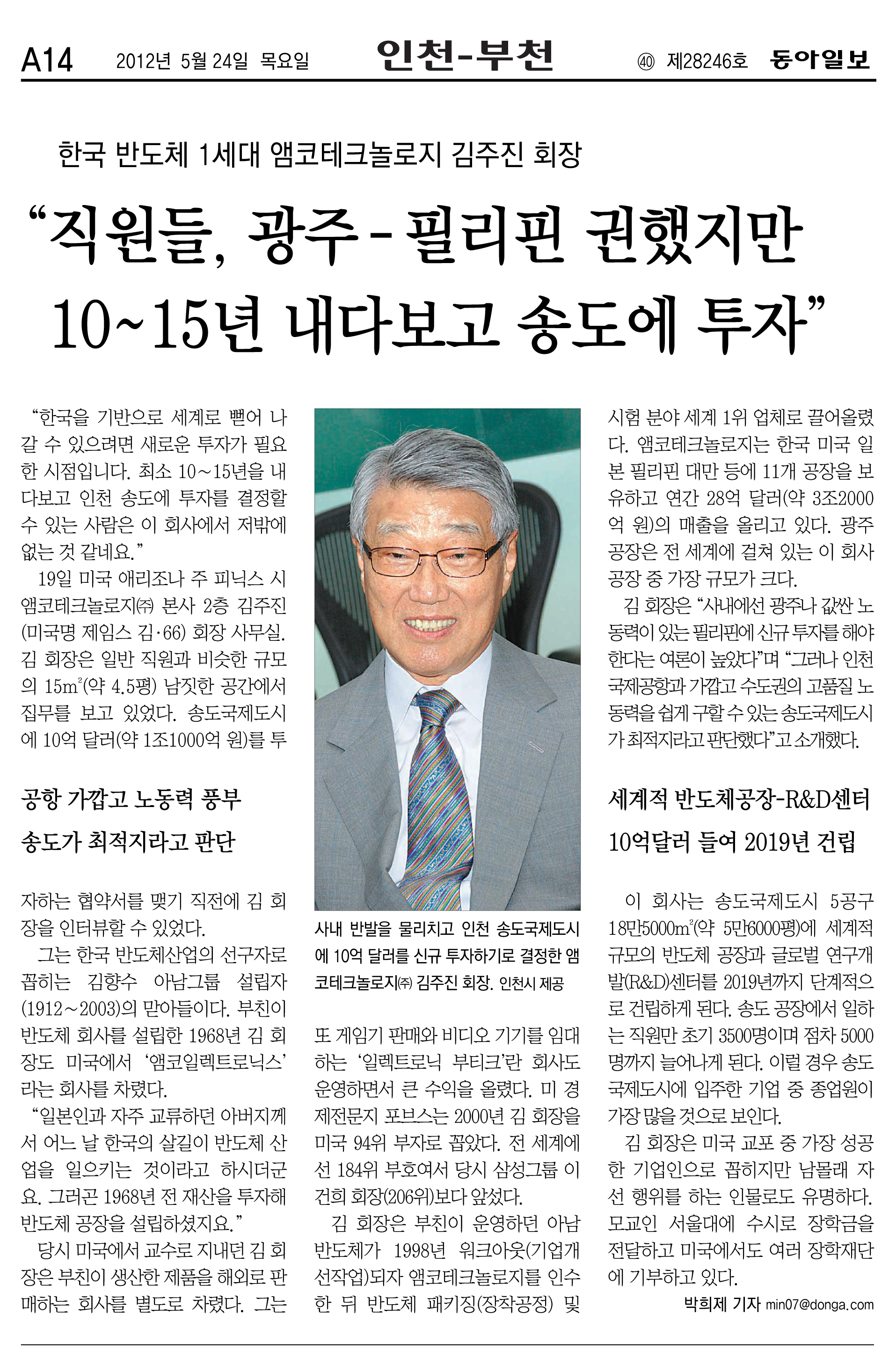 김주진 명예회장은 ‘반도체도 자동차처럼 조립의 예술’이라며, “반도체 패키징은 모든 전자제품을 최적화해주는 핵심공정”이고 “첨단기술 없이는 절대 세계 1위가 될 수 없는 분야”라고 강조했다.