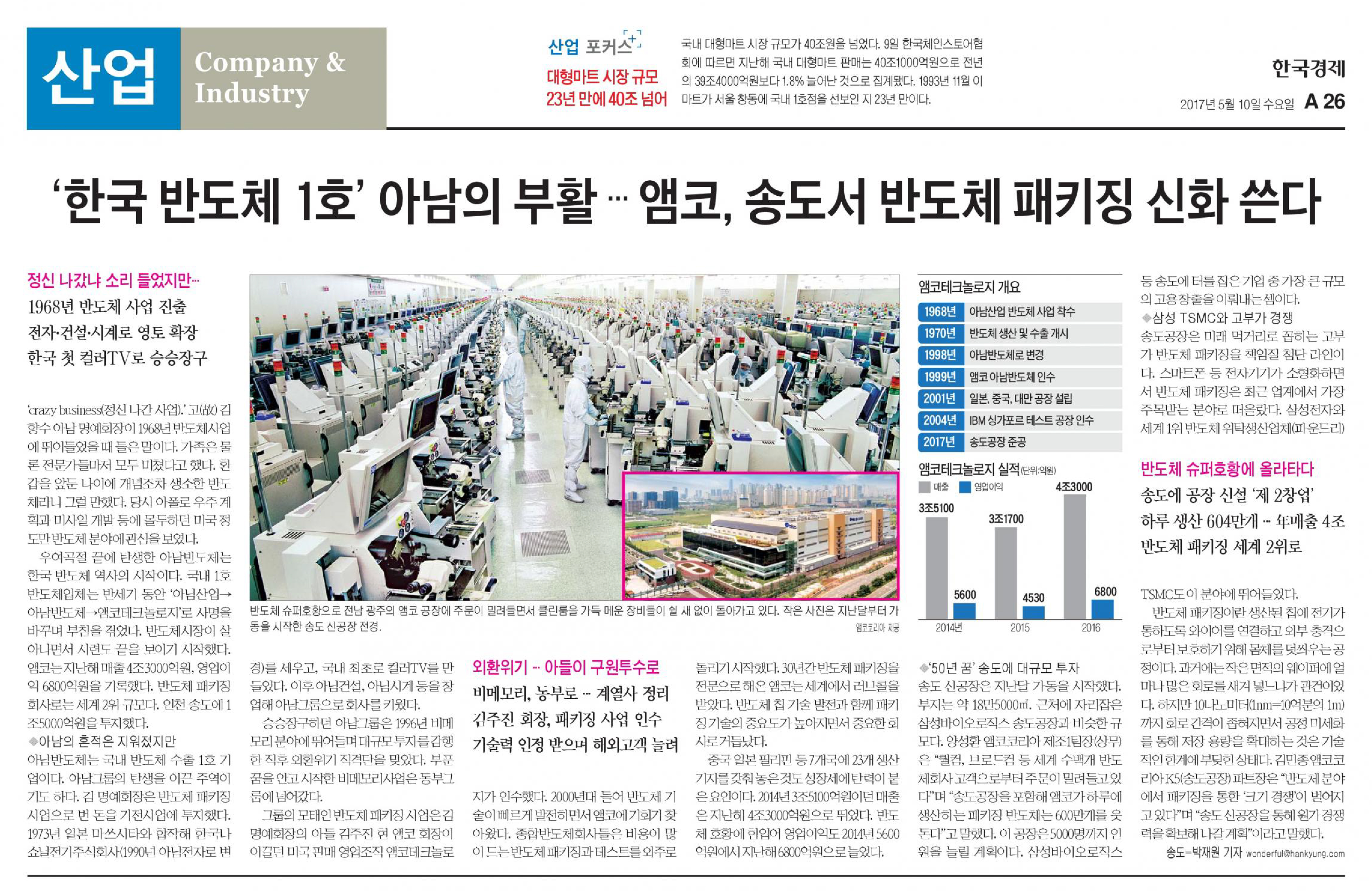 앰코테크놀로지는 2013년 인천자유구역 송도에서 글로벌 R&D센터 및 K5사업장 건립을 위한 기공식을 개최하고, 2017년에는 웨이퍼 레벨 팬아웃(WLFO) 반도체 패키징 솔루션 분야 세계적인 기업인 나니움(NANIUM)을 인수했다. 현재 앰코는 전 세계 12개국에 전략적 요충지에 생산기지와 영업사무소를 두고 있으며, 3만여 명의 임직원이 근무 중이다.