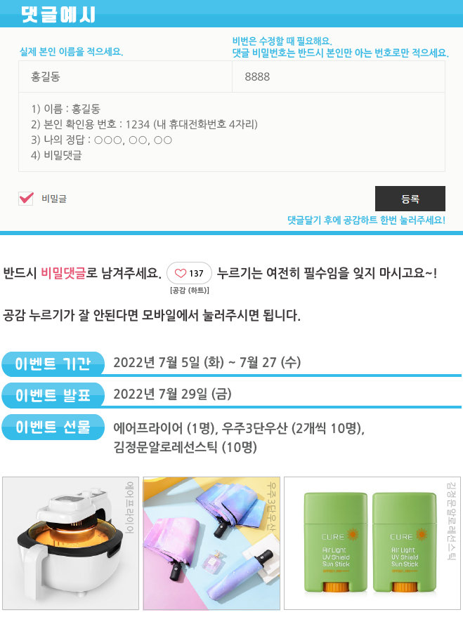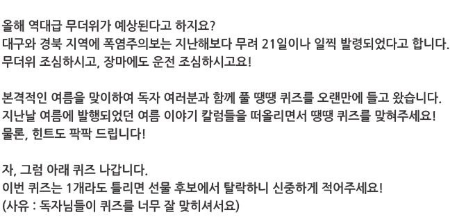 | 여름 땡땡 퀴즈 이벤트 결과 발표 _ 웹진 [앰코인스토리] (32) | 2022.07.29 |