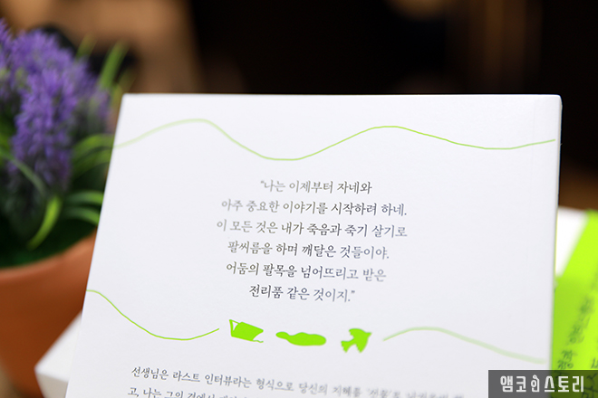 책을 읽는 동안 이어령 선생이 남긴 좋은 문장에 꼬박꼬박 밑줄을 치려 했습니다만, 몇 장 밑줄을 치다 포기하고 말았습니다. 어느새 모든 문장에 밑줄을 긋고 있었거든요. 죽는 순간까지도 명쾌하고 명징한 관찰자로서 반짝이는 지혜의 말들을 쏟아낸 이어령 선생이나, 이 말들을 적절히 끄집어내어 빠짐없이 풀어낸 김지수 기자나 참 만만치 않습니다. 덕분에 한 장을 넘기고 긴 숨을 쉬며 음미하고, 또 음미하며 읽게 됩니다. 테이블 옆에 앉아 두 분의 이야기를 듣는 기분으로 책을 읽어보시지요. 굳이 한 마디 끼어들지 않아도, 그 자리에 있는 것만으로도 기쁘고 충만합니다. 선생처럼 살아가는 일은 너무 벅찰 것 같습니다만, 그래도 선생의 삶을 닮고 싶다고 생각합니다. 자신의 무늬를 그리면서, 메멘토 모리를 새기면서.