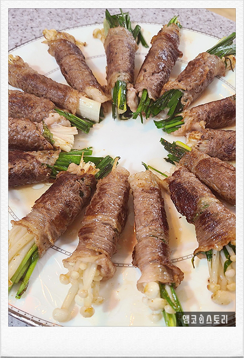 ④ 차돌박이에 부추와 버섯 넣고 돌돌 말아준다.