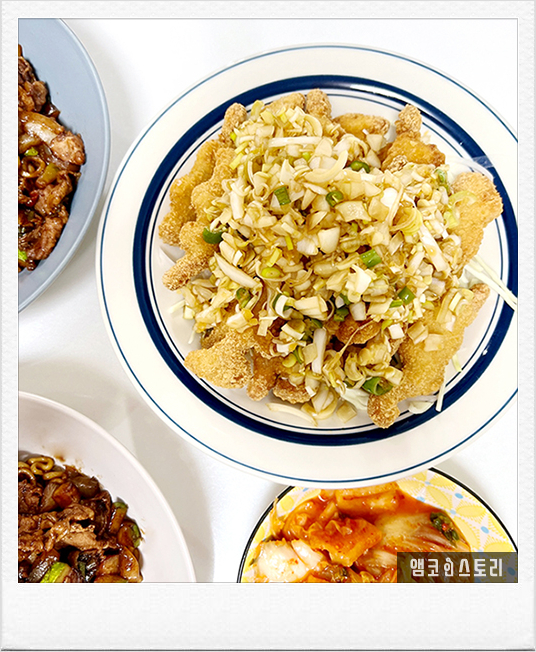 ④ 먼저 만들어 둔 소스를 그 위에 부어주면 간단 유린기 완성!