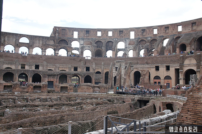 저 아래 1층에서 검투사들이 목숨을 건 사투를 벌이고, 이를 즐기는 로마 시민들이 흥분해서 환호하던 바로 그 장소에 우리가 서 있는 것이다. <글래디에이터> 영화 속에서 러셀 크로를 향해 “막시무스! 막시무스!” 환호하는 소리가 들리는 듯도 하다.
