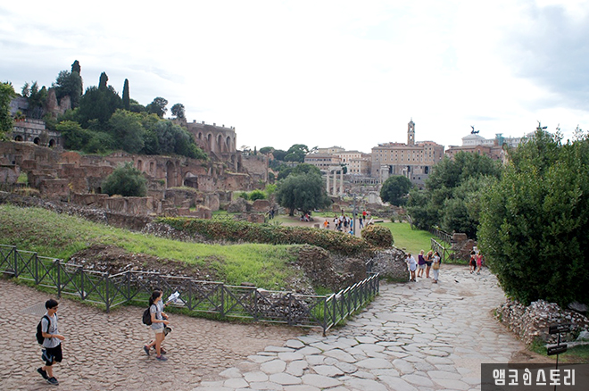 콜로세움에서 바깥쪽을 보니 저 너머로 포로 로마노 언덕이 보인다. 이제야 로마에 있음이 실감 나기 시작한다.