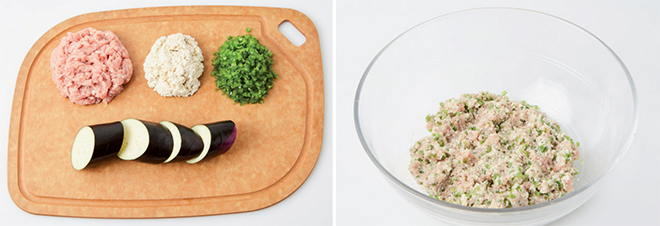 ① 돼지고기, 두부, 아삭이고추는 잘게 다지고, 가지는 어슷하게 4등분해 가운데 칼집을 넣는다.