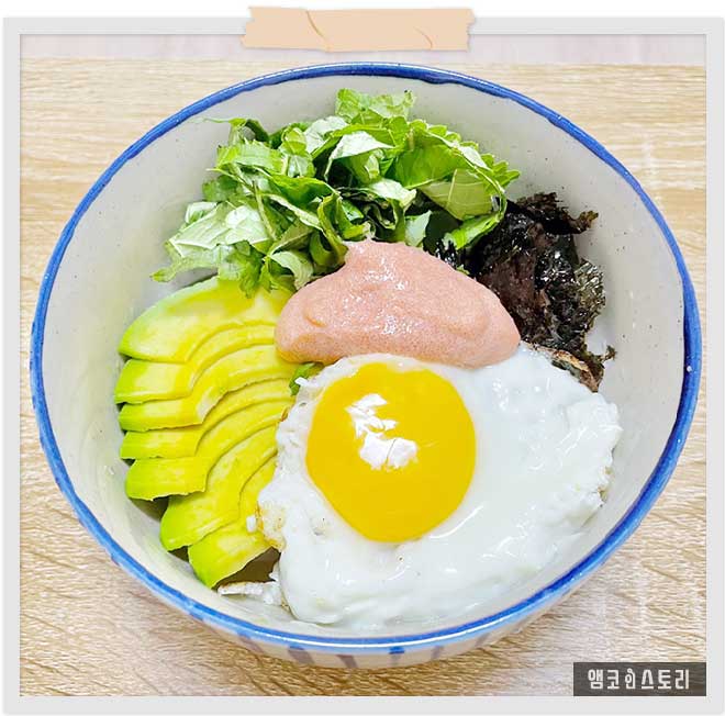아보카도, 명란젓, 깻잎, 계란, 김가루, 밥 등