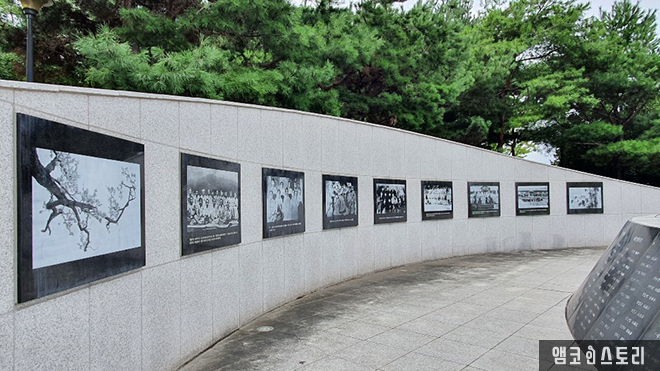 원형의 기단 둘레에는 건국훈장 대한민국장이 추서된 서재필과 건국훈장 대통령장이 추서된 양한묵을 비롯하여 광주·전남 출신의 독립유공자 1,000여 명의 명단을 새겨놓았어요. 한 분 한 분의 존함을 마주할수록 절로 마음이 숙연해지며 웅장함을 느낍니다. 기단 위에는 독립운동을 이끈 순국선열과 애국지사들을 상징하는 동상들이 원형으로 배치되어 있어요. 금박을 입은 사실적 형상은 다부진 팔과 다리, 꽉 죈 주먹과 결의에 찬 표정이 인상적입니다. 독립을 향한 그들의 의지가 그대로 전해져 가슴 한쪽이 뜨거워지네요. 뒤편의 조형 벽에는 3·1 만세운동을 전개하다가 체포된 광주 수피아 여학교 학생들의 출옥 후 모습, 일제의 야만적인 호남의병 진압 작전에 끝까지 항전하다가 체포되어 순국한 호남 의병장들의 모습을 담은 아카이빙 자료들이 전시되어 있습니다.