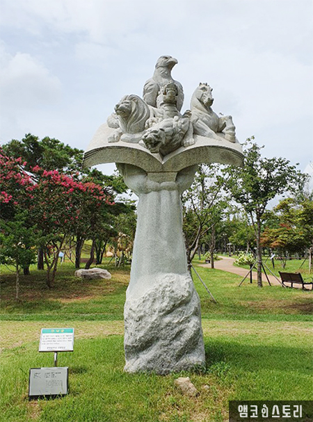 다음은 박세훈 작가의 <꿈꾸는 자를 위하여>라는 작품입니다. 꿈꾸는 자에게는 희망이 있다는 메시지를 전달하고 있는데요, 작가는 공원을 찾아오는 어린이들에게 정보 지식에 대한 상징적인 이미지를 전하고자 이 조각을 제작하였다고 해요. 책 속의 내용이 형상으로 살아날 것만 같은 모습, 그것을 든든히 받치고 있는 거대한 팔이 인상적입니다.