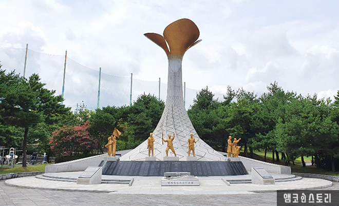 저 멀리 <광주독립운동 기념탑>이 위풍당당합니다. 광주·전라남도 출신의 독립운동가들을 추모하기 위하여 건립된 탑은 8월이면 그 의미가 더욱 깊게 와 닿는데요, 탑은 시민공모를 통하여 선정된 ‘평화의 꽃-피어오르다’라는 작품으로 높이 14m에 이르는 탑신과 조형 벽, 동상 등으로 구성되어 있습니다. 원형의 기단에서부터 뿌리를 상징하는 크고 작은 조각들의 조합이 원을 그리며 상승하여 하나로 만나 꽃을 피우는 모습, 이는 독립운동의 소중한 희생이 자양분이 되어 오늘날의 대한민국을 꽃피웠음을 의미한다고 해요. 기념물 좌우로 건립취지문과 광주-전남의 독립운동을 새긴 안내석이 자리합니다. 그 앞에 잠시 서서 찬찬히 글귀를 읽어 내려갑니다. ‘만약 호남이 없었다면 국가가 없었을 것’이라는 첫 문장부터 가슴을 치네요.