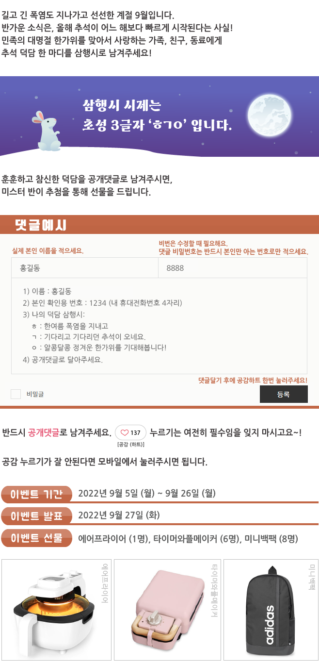 | 한가위 덕담 [초성 삼행시] 이벤트 결과 발표 (20) | 2022.09.27 |