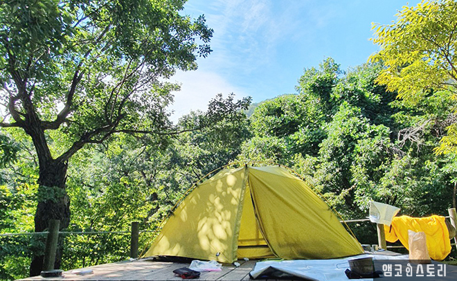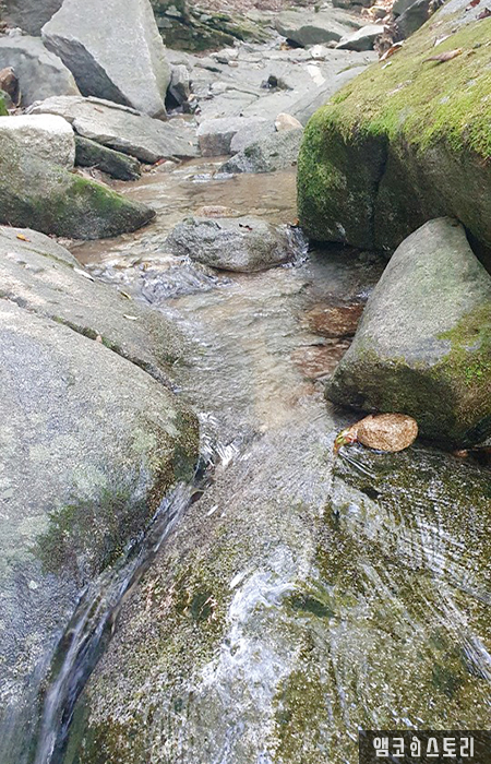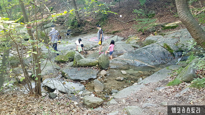올 때는 무겁게 갈 때는 가볍게! 머문 자리는 아니 온 듯 깨끗하게 정리하고 철수하는 하산길은 가벼운 발걸음이 계속됩니다. 입구 쪽이 가까워지니 물소리가 제법 가까이서 들려요. 참새가 방앗간을 지나치지 못하고 배낭을 내려놓습니다. 벌써 많은 사람이 물가에 앉아 발을 담그고 시원한 오후를 즐기고 있는데요, 장마철이 지나 수량은 좀 부족했지만 그 시원함은 더했어요. 계곡물에 세수도 하고 팔 다리도 씻고 하니 금세 상쾌해진 기분, 역시 계곡이 진리예요. 다만 어쩔 수 없는 모기는 알아서 주의해야 해요. 청량함에 넋을 놓고 잠시만 멍 때려도 모기는 득달같이 달려드는 산모기는 후유증도 커서 간지럽다 못해 쓰릴 정도예요. 모기 기피제 등의 대비는 꼭 하고 가는 게 좋습니다.