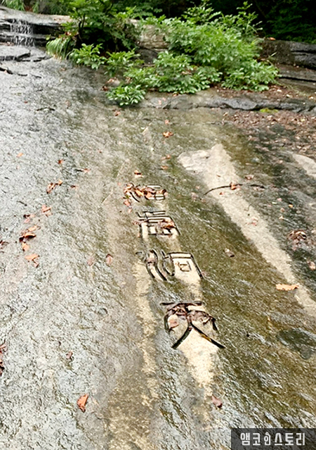 사이트 구축 후 제2 야영장 길을 따라 더 올라가 봅니다. 폭포가 흐르는 바위에 새겨진 ‘涵虛洞天’ 네 글자를 보기 위함인데요, 조선 전기의 승려 기화(己和)가 마니산(摩尼山) 정수산(精修寺)를 중수하고 이곳에서 수도했다고 해서 그의 당호(堂號)인 ‘함허’를 따서 ‘함허동천’이라는 이름이 붙었는데요, 계곡의 너럭바위에는 기화가 썼다는 涵虛洞天 네 글자가 선명한 바위를 만날 수 있답니다. 이미 많이 올라온 덕에 얼마 가지 않아 그 모습을 마주할 수 있었어요. 시원하게 흐르는 폭포와 그 물을 온전히 받는 너럭바위, 그 위에 깊게 새겨진 涵虛洞天. 글씨 모양이 참 이쁘네요.