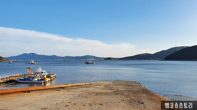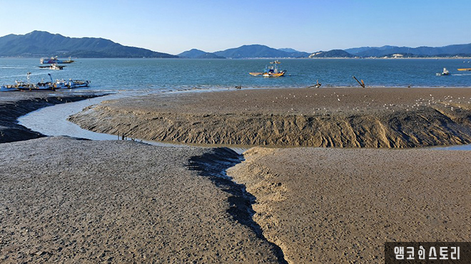선수포구에 도착하여 항구의 풍경에 잠시 취해봅니다. 후포항에는 바다를 따라 산책 데크가 설치되어 있어요. 썰물 때라 물이 많이 빠진 모습으로 갯벌이 드러나 있고 그 위로 배들이 정차되어 있어요. 잔잔한 물결 너머 아득한 산새도 아름다운 풍경을 완성하고 있네요. 가만히 보기만 해도 절로 힐링이 됩니다. 갯벌의 풍경은 마치 전라도 순천의 순천만을 떠올리게 해요.