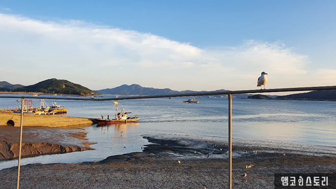 주차장에 주차하자 저 멀리 바다가 보입니다. 엄지 척! 따봉을 치켜세우며 관광객을 맞이하는 새우 조형물이 재미를 선사합니다. 바다 건너 석모도가 바라다보이는 항구의 모습, 여전히 그곳을 지키고 있는 선착장에 다다르자 과거 카페리호를 타던 추억이 아련히 떠오릅니다. 이제 이곳을 오가는 배는 없지만 배를 따라 날아다니던 갈매기들은 여전히 자리를 지키고 있었어요.