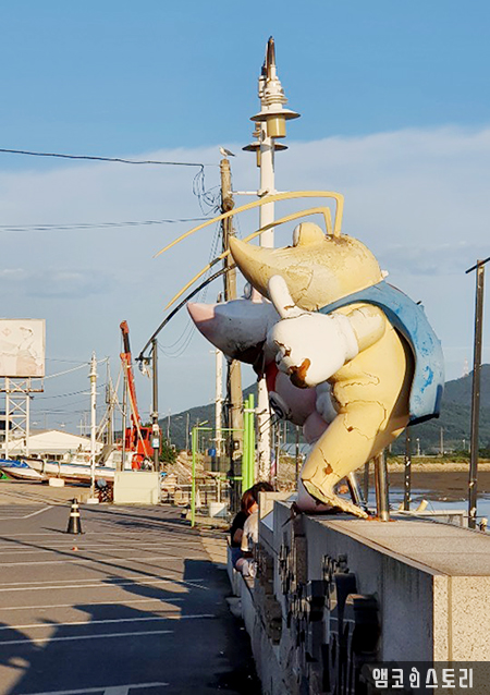 밴댕이 회를 뒤로하고 마을을 좀 더 둘러보기로 합니다. 아스팔트를 파랗게 물든 물감, 듬성듬성 그려진 물고기를 따라 발걸음을 크게 뛰어도 봅니다. 그곳의 세븐일레븐 편의점은 그냥은 지나칠 수 없는 포토존이 존재합니다. 건물 앞 크게 페인팅 된 편의점 로고가 그것인데요, 그 기획이 세븐 본사가 아닌 편의점 점주에 의한 점이라는 것도 놀랍습니다. 얘기를 나눠보니 참 진취적이고 열정적인 분이셨어요.