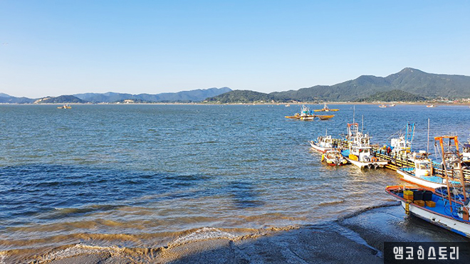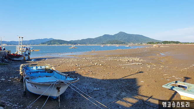 선수포구에 도착하여 항구의 풍경에 잠시 취해봅니다. 후포항에는 바다를 따라 산책 데크가 설치되어 있어요. 썰물 때라 물이 많이 빠진 모습으로 갯벌이 드러나 있고 그 위로 배들이 정차되어 있어요. 잔잔한 물결 너머 아득한 산새도 아름다운 풍경을 완성하고 있네요. 가만히 보기만 해도 절로 힐링이 됩니다. 갯벌의 풍경은 마치 전라도 순천의 순천만을 떠올리게 해요.