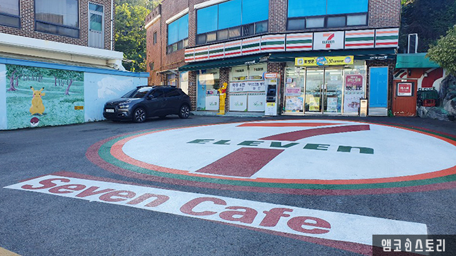 밴댕이 회를 뒤로하고 마을을 좀 더 둘러보기로 합니다. 아스팔트를 파랗게 물든 물감, 듬성듬성 그려진 물고기를 따라 발걸음을 크게 뛰어도 봅니다. 그곳의 세븐일레븐 편의점은 그냥은 지나칠 수 없는 포토존이 존재합니다. 건물 앞 크게 페인팅 된 편의점 로고가 그것인데요, 그 기획이 세븐 본사가 아닌 편의점 점주에 의한 점이라는 것도 놀랍습니다. 얘기를 나눠보니 참 진취적이고 열정적인 분이셨어요.