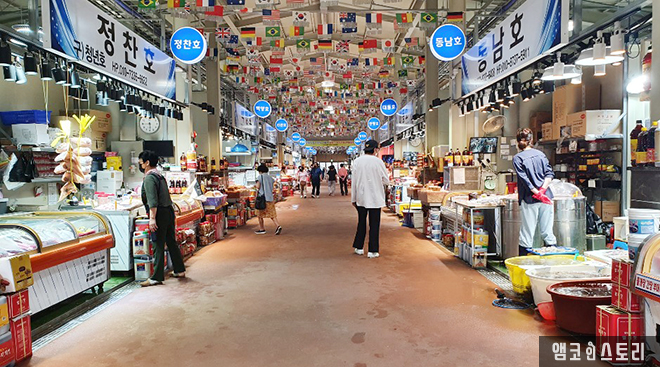 넓은 주차장 한편에 외포항 젓갈 수산물 직판장이 자리하고 있습니다. 최근에 지어진 건물은 크고 깔끔했어요. 실내를 들어서자 천장 가득 만국기가 환영 인사를 건넵니다. 길게 이어진 건물 좌우로 매장들이 들어서 있는데요, 대부분 생선을 비롯한 수산물과 각종 젓갈류예요. 마음 내키는 곳에 가 젓갈을 구매하고 한 접시에 만 원하는 회도 구입합니다. 이제 조금 있으면 낙조 시간이에요. 서둘러야겠어요.