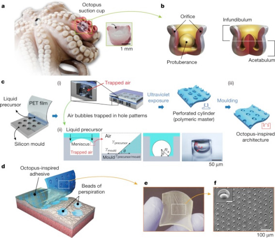 성균관대 방창현 교수 연구팀은 이렇듯 강력한 문어의 빨판을 가지고 생체모방기술을 연구하였습니다. 이를 통해 개발된 패치는 물속이나 접착제의 기능이 제대로 발휘되기 어려운 조건에서도 무리 없이 강력한 접착 효과를 발휘하는 것이었지요. 또, 패치 탈부착 시 어떠한 오염물도 남기지 않는 것이 가능하다고 합니다. 기존의 화합물로 만든 강력한 점착 소재들은, 예를 들어 풀이나 스티커 같은 경우 소재를 제거하고 난 이후 점착력이 사라지거나 끈적거리는 오염물이 남아 애를 먹는 경우가 종종 있었지요. 하지만 빨판을 모방한 새로운 소재는 탈착 이후에 아무 흔적도 남기지 않는다고 하네요.