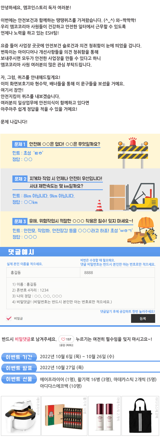 | 웹진 [앰코인스토리] 안전보건과 함께하는 땡땡퀴즈 결과 발표 (20) | 2022.10.27 |