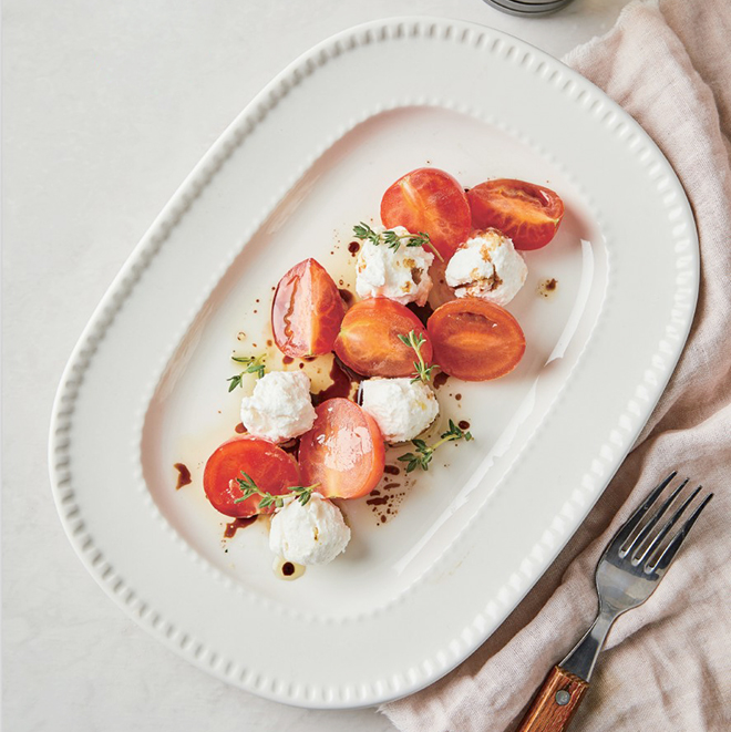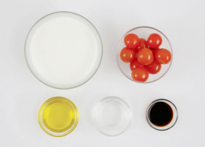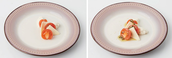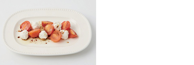 ⑤ 그릇에 방울토마토와 리코타치즈를 올리고 발사믹 드레싱을 뿌린다.