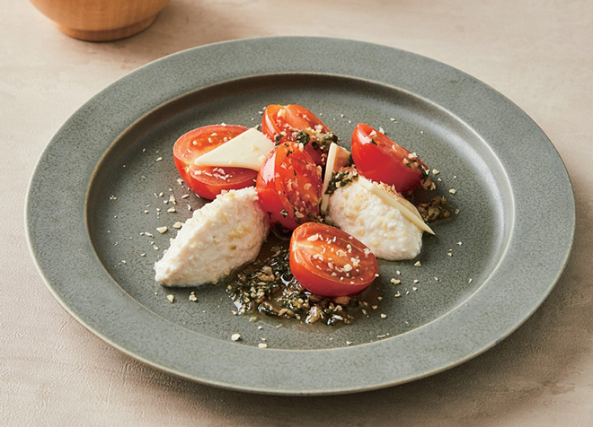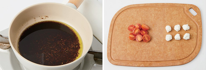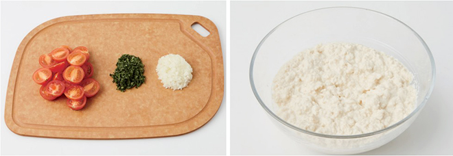 ④ 방울토마토는 반으로 썰고, 굳힌 리코타치즈는 한입 크기로 만든다.