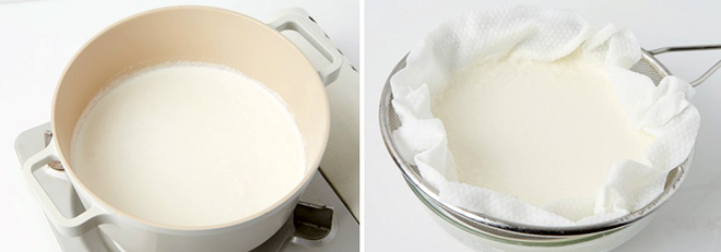① 냄비에 우유(370㎖)를 넣어 센 불로 올린 뒤 가장자리가 끓어오르면 레몬즙(20g)을 넣어 몽글해질 때까지 젓는다.