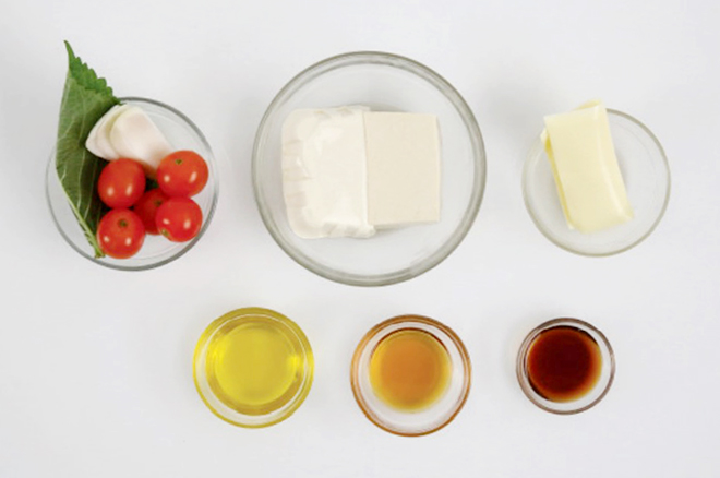 깻잎(2장), 양파(20g), 방울토마토(5개=50g), 연두부(100g), 두부(100g), 다진 마늘(10g), 치즈(40g)
