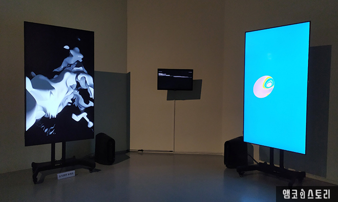 다니엘 이레기 <편재>를 중심으로 양쪽에 위치한 작품은 안드레아스 슐레겔의 <머신 드림>과 바론 란텐느의 <유형(有形) 데이터>라는 작품이에요. <머신 드림>은 인공지능을 활용한 이미지 생성시스템이에요. 머신러닝의 강화학습과 최신 그래픽 기술의 하나인 ‘레이마칭(ray Marching)’ 기법을 통해 전달되는 이미지들이 점점 추상적으로 변해가는 과정이 흥미를 유발합니다. 바론 란텐느의 <유형(有形) 데이터>는 블록체인에 기반한 스크린 조각(NFT)으로 가상의 세계로 열리는 포털의 형태를 취하는 스크린 기반의 설치 작품이예요. 다면적 메커니즘을 통해 미학적 잠재의식을 일깨우는 작품은 가만히 보고 있자니 현실과 가상의 경계가 모호해지는 느낌입니다. 마치 영화 <인셉션>을 보는 것 같았어요.