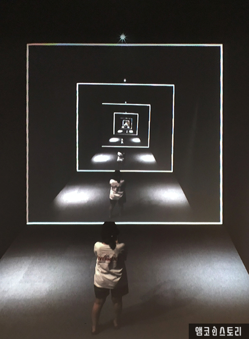 고개를 돌리자 다니엘 이레기의 <편재(編在>가 보여요. 오디오-비주얼 인터렉티브 미장아빔(mise en abyme)로 그림 속의 그림이라고 하는데요, 무한대의 디지털 거울 앞에 선 관람객은 끊임없이 생성되는 반사율에 의한 형상을 볼 수 있어요. 이리저리 몸을 움직이고 동선을 이동하자 프레임 쪼개지듯 이어지는 반사율의 형상들, 제어도 통제도 안 되는 이미지의 향연은 즐거움 속에서도 디지털 세계를 대면하는 우리의 무력함에 대한 불안감을 불러온다고 해요.