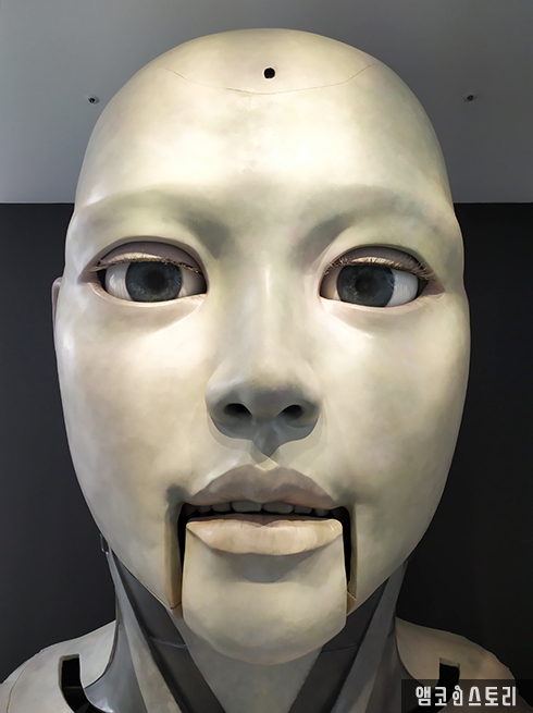 현재 관람이 가능한 전시는 3층에서 운영 중이라고 해요. 부속 타이틀로 <자연과 인간, 기계의 공명>을 가지는데요, 엘리베이터를 타고 3층을 내리는 순간 결코 지나칠 수 없는 엄청난 존재감을 내뿜는 작품을 만나게 돼요. 노진아 작가의 <테미스, 버려진 AI>라는 작품인데요, 어딘지 괴기한 형상의 AI 두상은 이마에 카메라가 내장되어 관람자의 위치를 파악해 시선이 동선에 따라 움직입니다. 큰 목소리로 말을 걸면 질문에 답을 하기도 하는데요, 이름이 무엇이냐는 질문에 ‘이름은 테미스다’라고 말하는 AI의 음성이 낯설고 재밌게 느껴집니다.