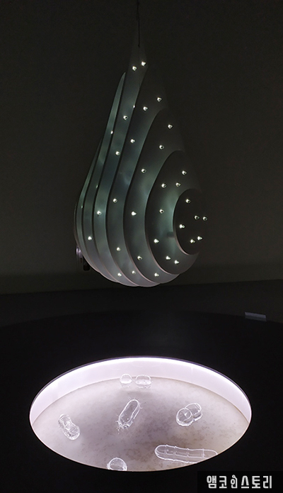 <이상*한*5*18> 앞쪽으로는 샤샤 스파찰의 <흘린 눈물의 도서관>이 전시되어 있어요. 눈물 모양의 거대한 조형물이 은은한 빛을 발하며 공중에 부양해 있는 모습, 그 아래로는 투명 애벌레 모형의 조형물이 여럿 보여요. 광주의 슬픈 역사에 영감을 받아 제작되었다는 작품은 여러 사람의 눈물을 모아 배양한 미생물을 분말로 제작하여 보관하는 눈물의 도서관이라고 해요. 오늘날 인류가 흘리는 눈물을 상기하며 지금도 눈물의 도서관을 채워가고 있는 우리 시대를 돌아보게 한다고 해요.