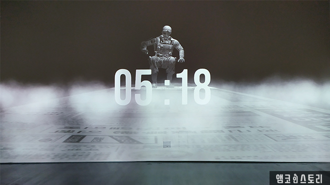 AI 테미스를 지나쳐 입장한 곳은 제3전시실입니다. 앞서 3개월의 전시가 끝난 현재 관람이 가능한 유일한 전시관인데요, 이곳에는 권두영 작가를 비롯해 총 다섯 작가의 미디어아트 작품을 만날 수 있어요. 먼저, 입구를 들어서자 오른쪽에 위치한 작품은 권두영 작가의 <이상*한*5*18>입니다. 5.18 민주화 운동 당시의 기록 사진을 바탕으로 인공지능이 시인 이상의 초현실주의 시를 구현하는 작품인데요, 인공지능이 수집한 이미지 데이터는 알고리즘을 통해 텍스트로 출력되고, 이는 관객의 초상화를 구현한다고 합니다. 관람객 참여를 통해 변화하는 작품의 특성이 흥미롭네요.