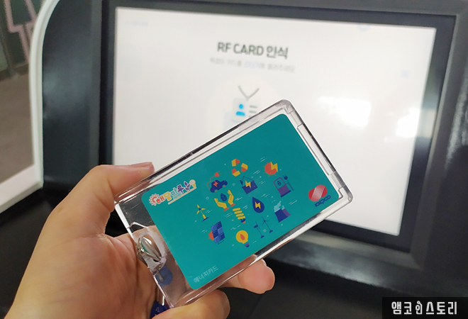 건물을 들어서자 넓은 로비로 대형 현수막이 방문객을 맞이합니다. 매월 22일은 에너지의 날임을 알리는 문구는 이곳에서 에너지를 바꾸기 위한 기념식 및 소통행사, 에너지 절약 캠페인, 토크콘서트 등이 열리고 있음을 알려줍니다. 더불어 ‘함께하고 실천하는 탄소 중립’을 위한 광주 RE100 시민클럽을 모집하는 안내문도 만날 수 있었어요. 에너지전환 교육 제공, 선진지 탐방 기회 제공 등의 다양한 특전이 있으니 관심 있는 분들은 참여해 보길 바랍니다. 또한, 안내데스크에서는 관람객의 효율적인 전시 관람을 돕기 위해 체험 카드를 발급하고 있어요.
