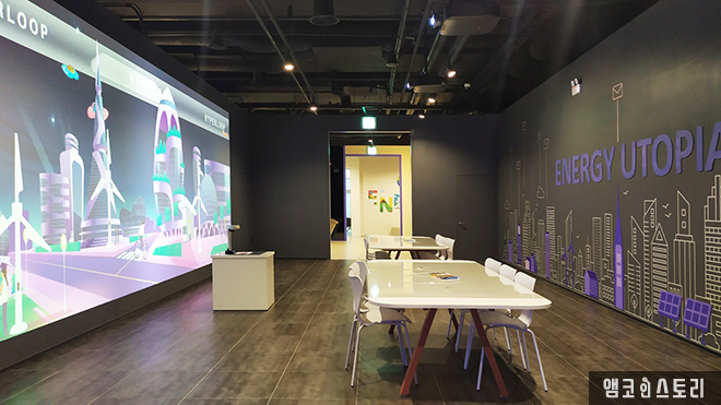 다음은 기후환경변화와 신재생에너지 기술을 만나볼 수 있는 ‘그린플래닛’입니다. 이곳의 다양한 시설물은 체험 카드 터치 후 작동이 되는데요, 빛을 모아 에너지로 바꾸는 태양광 에너지의 과정, 풍력에너지 발전 체험, 자가 발전 시스템 등 8개의 재생에너지와 3개의 신에너지에 대한 설명 및 체험을 할 수 있습니다. 한쪽으로 마련된 공간에서는 3면의 프로젝터 영상 연출을 통해 기후변화에 따른 지구환경과 신재생에너지의 필요성을 전달하고 있어요. 자칫 어렵게 느껴지는 에너지를 쉽고 재밌게 풀어 즐기며 배울 수 있다는 점이 인상 깊은 전시예요. 아이들과 오면 더없이 좋은 그런 곳이라 생각됩니다.