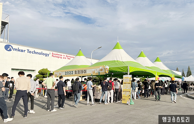 앰코코리아 K4사업장(광주)은 9월 22일부터 10월 5일까지 ‘2022 호프데이’ 행사를 개최했습니다. 3년만에 열린 이번 행사는 사업장 내에 행사장을 만들어 사원들을 위해 맥주와 목살 스테이크, 치킨 등 다양한 먹거리를 제공하였으며, 앰코코리아를 방문하였던 고객사, 협력사와 관계사는 물론, 사원자녀들도 함께 어울린 모습을 볼 수 있었습니다. 이번 행사로 사원들은 반복되는 일상에 잠시 벗어나 스트레스를 해소할 수 있는 소중한 시간을 가질 수 있었습니다.