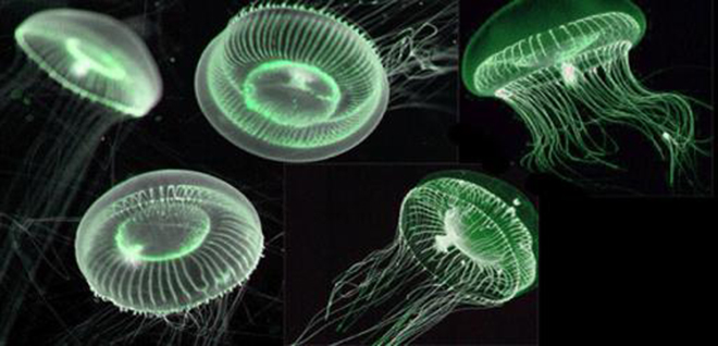 깊은 어두운 바다 속에서 영롱하게 빛을 내며 자유롭게 헤엄치는 해파리는 마치 SF 우주영화에서나 볼 법한 장관을 연출하기도 합니다. 그물처럼 넓게 펼쳐진 몸은 빛을 반사하여 칠흑 같은 우주 어느 공간을 유영하는 우주선 같습니다. 이는 바로 해파리의 녹색 형광 단백질, 즉 ‘GFP’ 덕분입니다.