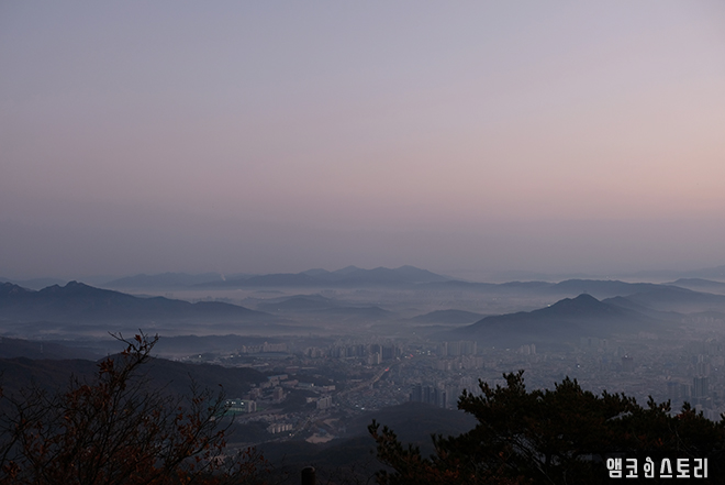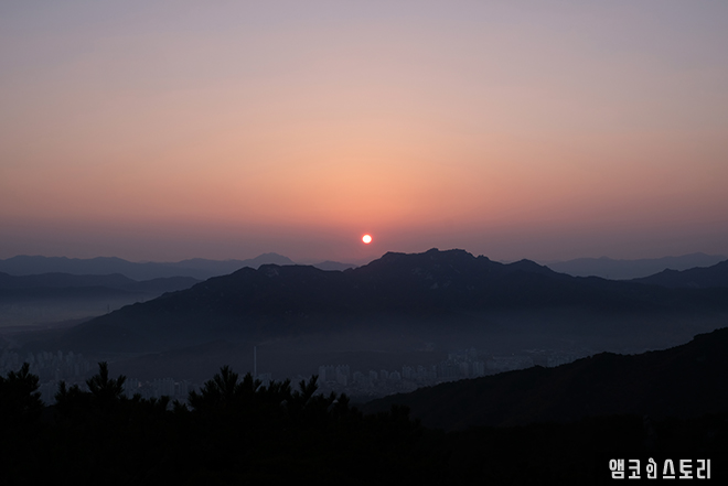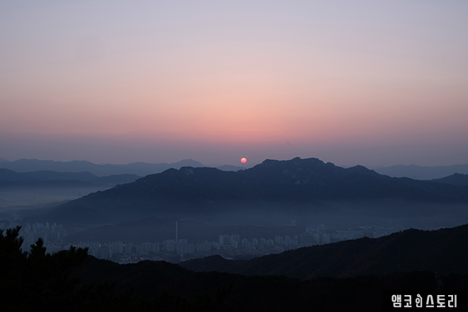 함께한 K3 등산동호회 회원분의 Surprise 카페 오픈으로, 따끈한 커피도 나눠 마시고 멋진 일출을 감상할 수 있었습니다. 점점 붉어지는 하늘부터 해가 떠오르고 난 후까지 눈을 뗄 수 없는 아름다운 광경이었습니다. 이날은 자욱한 안개가 도시에 깔려 더 멋스러운 운치를 자아냈던 것 같습니다.