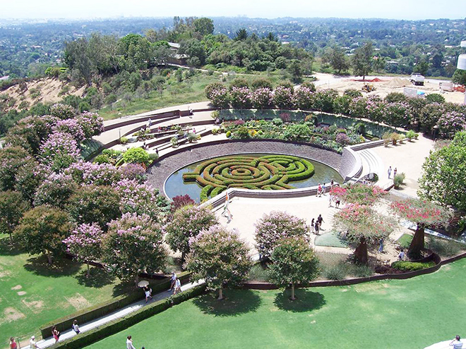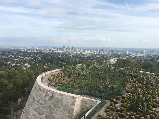또 다른 포인트는, 이 건축물들이 언덕 꼭대기에 지어져서 LA 시내를 한눈에 내려다볼 수 있는 전경입니다. 이곳의 가든 테라스 카페는 시내를 한눈에 보면서 차 한잔 마실 수 있는 야외 카페인데, 나른한 오후에 커피 한잔하면 세상 멋있는 폼은 다 잡은 것 같은 착각에 빠지게 합니다. 이뿐만 아니라 가든 또한 예술작품처럼 아주 조화롭고 예쁘게 만들어 4년 동안 계획하고 1년 동안 공사를 했다는 게 이해가 갈 정도입니다. 500종이 넘는 나무와 꽃들, 그리고 푸르른 잔디로 구성되어 있어 가든 하나만 봐도 아깝지 않을 정도입니다.
