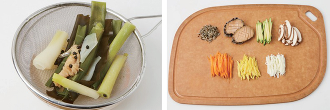 ② 건진 멸치는 잘게 다지고, 전복은 껍질과 내장을 제거한 뒤 칼집을 넣고, 애호박, 표고버섯, 당근, 달걀지단은 채 썬다.