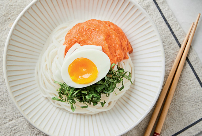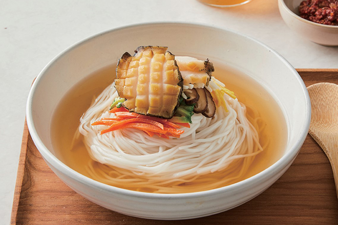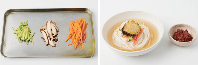 ⑥ 그릇에 삶은 소면 → 볶은 재료 → 익힌 전복 순으로 담고 육수를 붓는다.