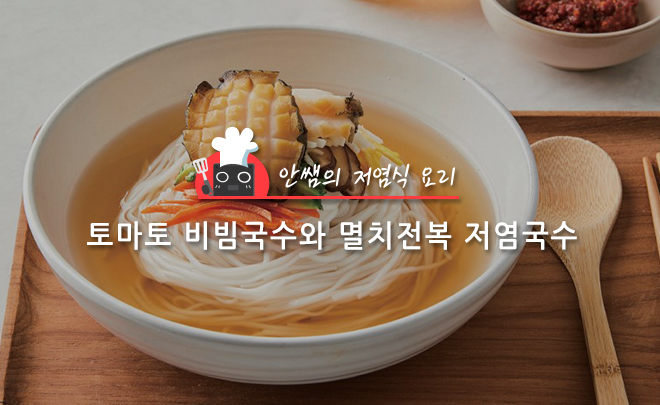오늘 소개할 요리는 토마토 비빔국수과 멸치전복 저염국수입니다. 각 요리의 저염 비법을 보면, 토마토 비빔국수는 토마토로 비빔소스를 만들어 고추장 사용을 줄였고, 멸치전복 저염국수는 멸치 양념장을 활용해 소금 사용을 줄였습니다.