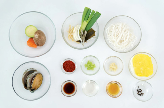 전복(2개), 애호박(20g), 표고버섯(15g), 당근(20g), 달걀지단(흰자, 노른자 각각 1장), 삶은 쌀소면(80g), 식용유(5㎖),
