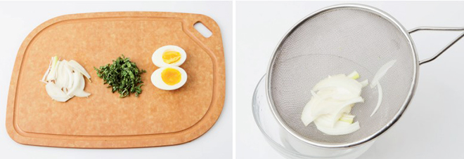 ① 양파와 바질은 채 썰고, 삶은 달걀은 반으로 자른다.