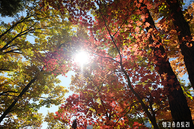11월 초 내연산은 노란 단풍이 가득해서 반짝반짝 눈부시는 아름다움이 있는 곳이었습니다. 내연산 문수봉과 정상 삼지봉은 조망이 거의 없어서, 단풍 구경을 위해 가신다면 계곡길만 트레킹 하는 걸 추천합니다.