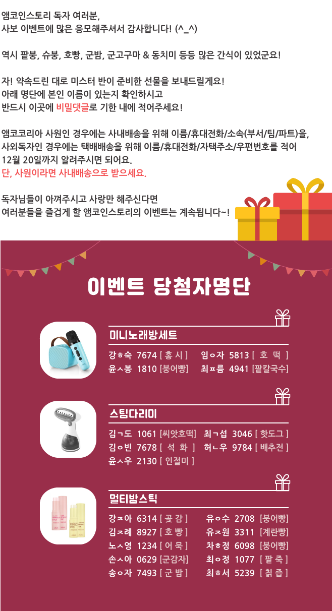 | 추억을 소환하는 연말 땡땡퀴즈! 결과 발표 _ 웹진 [앰코인스토리] (25) | 2022.12.26 |