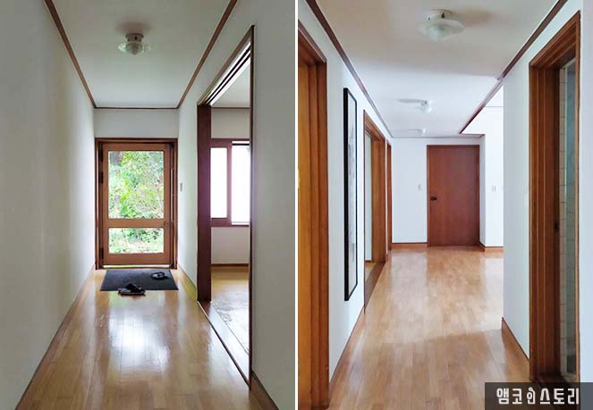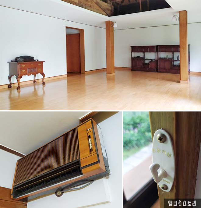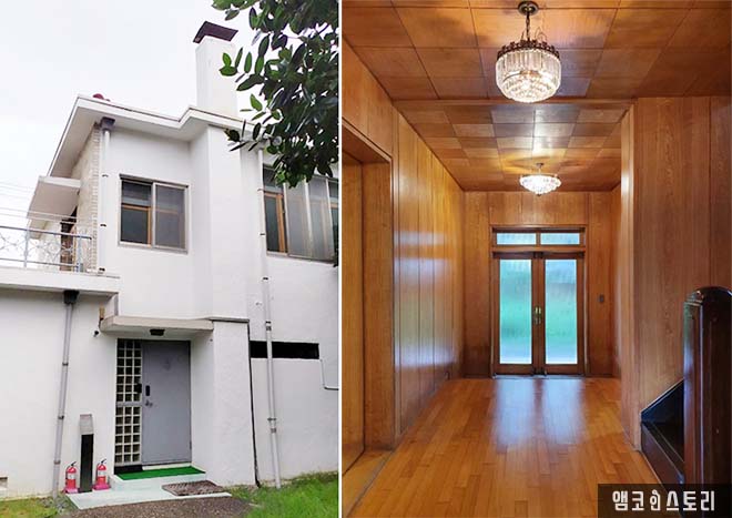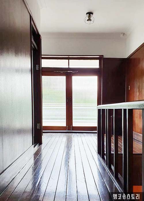 사랑채는 본채에 인접해 있습니다. 1958년에 지어진 건물은 원래의 사랑채를 헐고 새로운 터에 2층 양옥 형태로 지어졌는데요, 이곳에서는 박인천 회장의 장남 내외가 머물렀다고 해요. 방 5칸에 거실 1칸의 구성, 문을 들어서자 사방이 목재로 마감된 현관과 쭉 뻗은 복도가 보입니다. 천장으로 샹들리에 조명이 햇살이 빛을 발하고 마루는 광이 번쩍입니다.