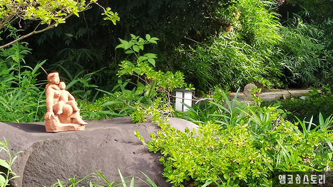 고즈넉하고 은은한 고택과 넓고 탁 트인 정원. 잘 정비된 마당으로는 작은 연못이 있고 그 속에는 잉어들이 노닙니다. 그리고 잔디밭 사이로 난 작은 길은 산책로를 이루고 있는데요, 마당 곳곳에는 진실스러움에 부응하다(조영자), 설레임(문옥자), 사람(김영중) 등등 유명 작가의 예술작품들이 배치되어 눈을 즐겁게 합니다.