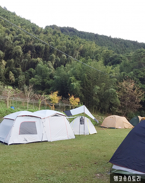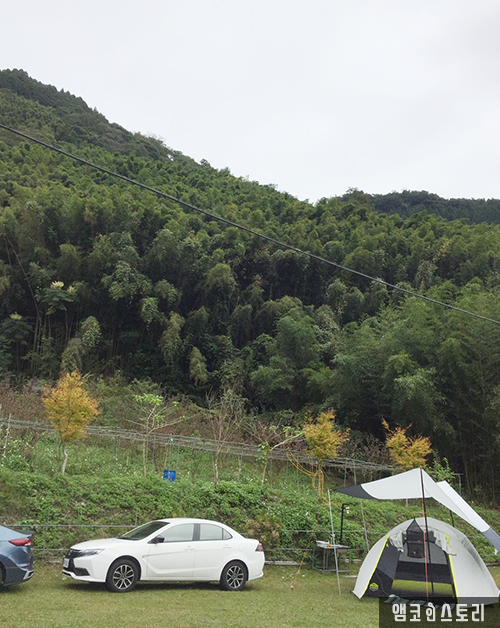 캠핑장 뒤편은 대나무 숲과 나무들로 구성된 숲으로 이뤄져 있는데, 이따금 바람에 따라 흔들리는 대나무 소리가 고즈넉한 분위기를 자아냅니다. 텐트 앞쪽으로는 저 멀리 운해, 구름바다가 있네요. 요즘 소위 불을 보면서 멍을 때리는 ‘불멍’이 인기라고 하는데, 필자는 운해를 보며 멍을 때려 봅니다.