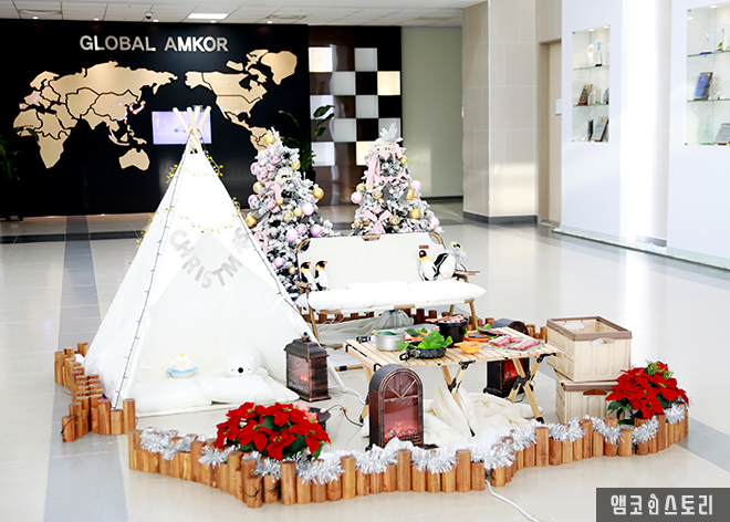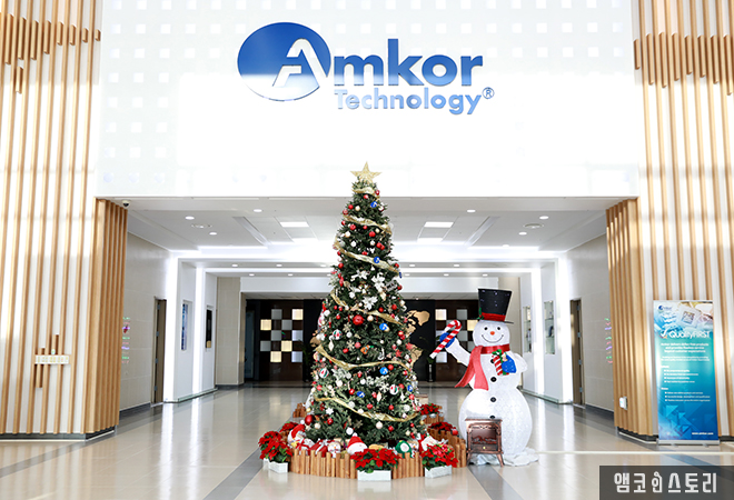 앰코코리아 전 사업장(인천 부평, 인천 송도, 광주)에서는 12월부터 약 한달 간 2022년을 마무리하는 크리스마스트리를 출입구 로비마다 설치하여 따뜻하고 연말 분위기를 조성하였습니다. 새해 덕담을 비롯한 따뜻한 마음을 전하시길 바라며, 가족 및 동료와 함께 위로와 격려의 메시지를 주고받으며 새해 소원을 나누어 보시기 바랍니다.